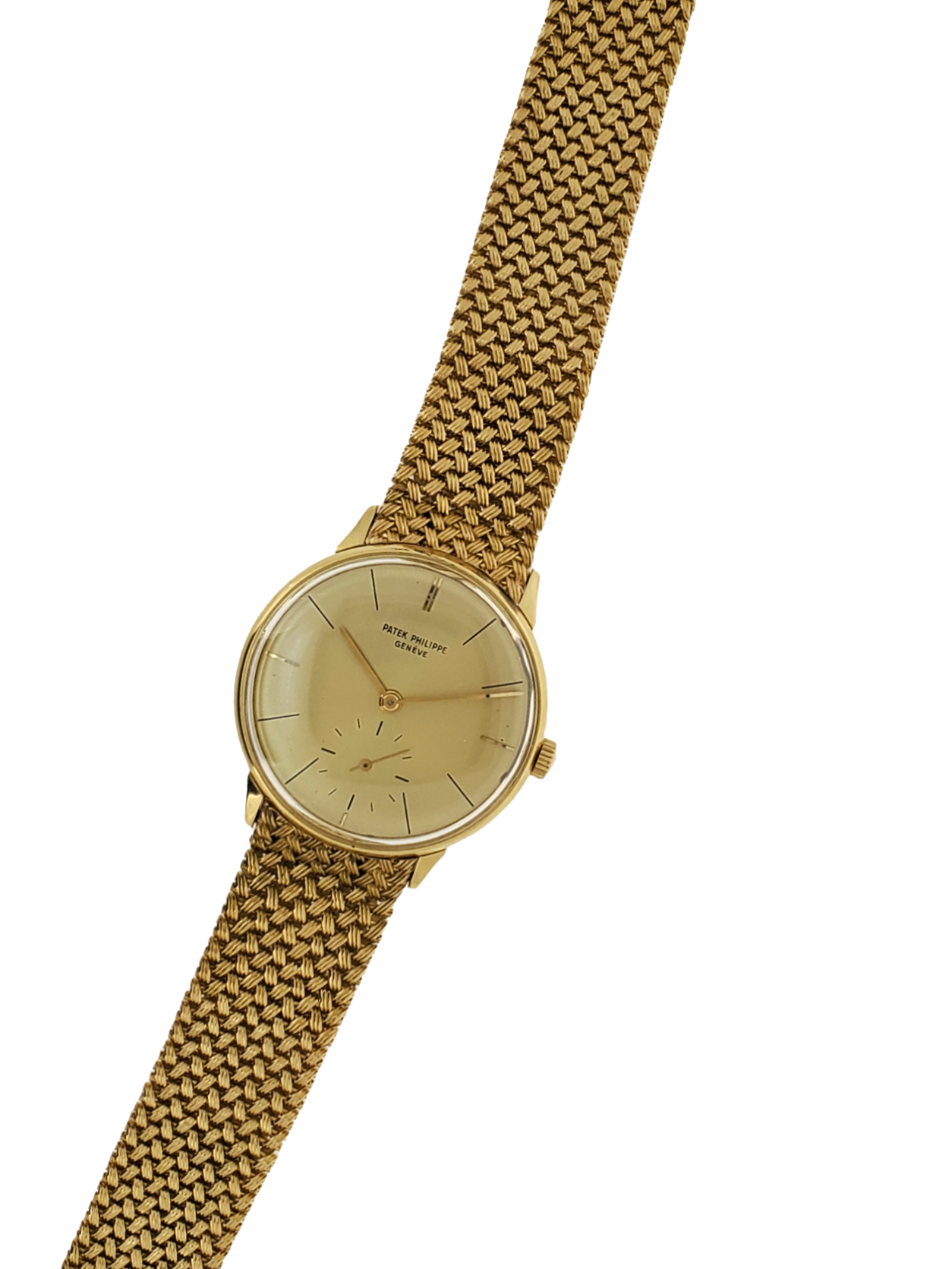 Patek Philippe 3420J Vintage Classic Calatrava, with articulating lugs. The watch is made in 18K yellow gold with very minimalist thin gold bezel, and dial design. The watch measuring 34mm in diameter but looks much larger on the wrist due to the dial size. The original factory dial is silvered Gilt with raised gold baton hour marker and hands. The watch was made in 1964, and is fitted with an 27 AM 400 A Magnetic movement # 732901, case # 430334. The watch is fitted with its original attached bracelet purchased in Geneva at the Salon. The watch is accompanied with its original certificate of origin, bill of sale, and box. It is also accompanied with a light brown alligator strap.