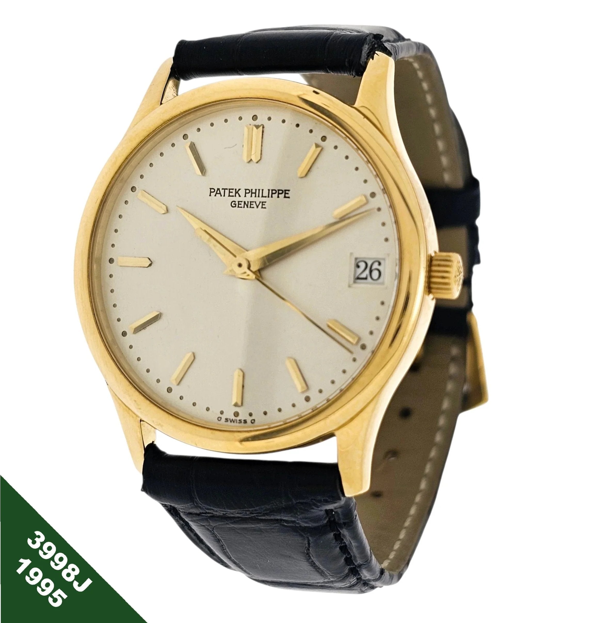 Patek Philippe 3998J; Automatic Calatrava measuring 34mm in diameter. The watch is made of 18 Karat Yellow gold, with a 315 SC caliber 30-jewel Automatic movement # 1912319, Case # 2934472. The watch is accompanied with a Patek Philippe black alligator strap, and its Patek 18K gold buckle. As you can see from the enclosed pictures the watch is in really excellent condition with very wear or use. This is an exceptional condition considering it age. Super mint example.