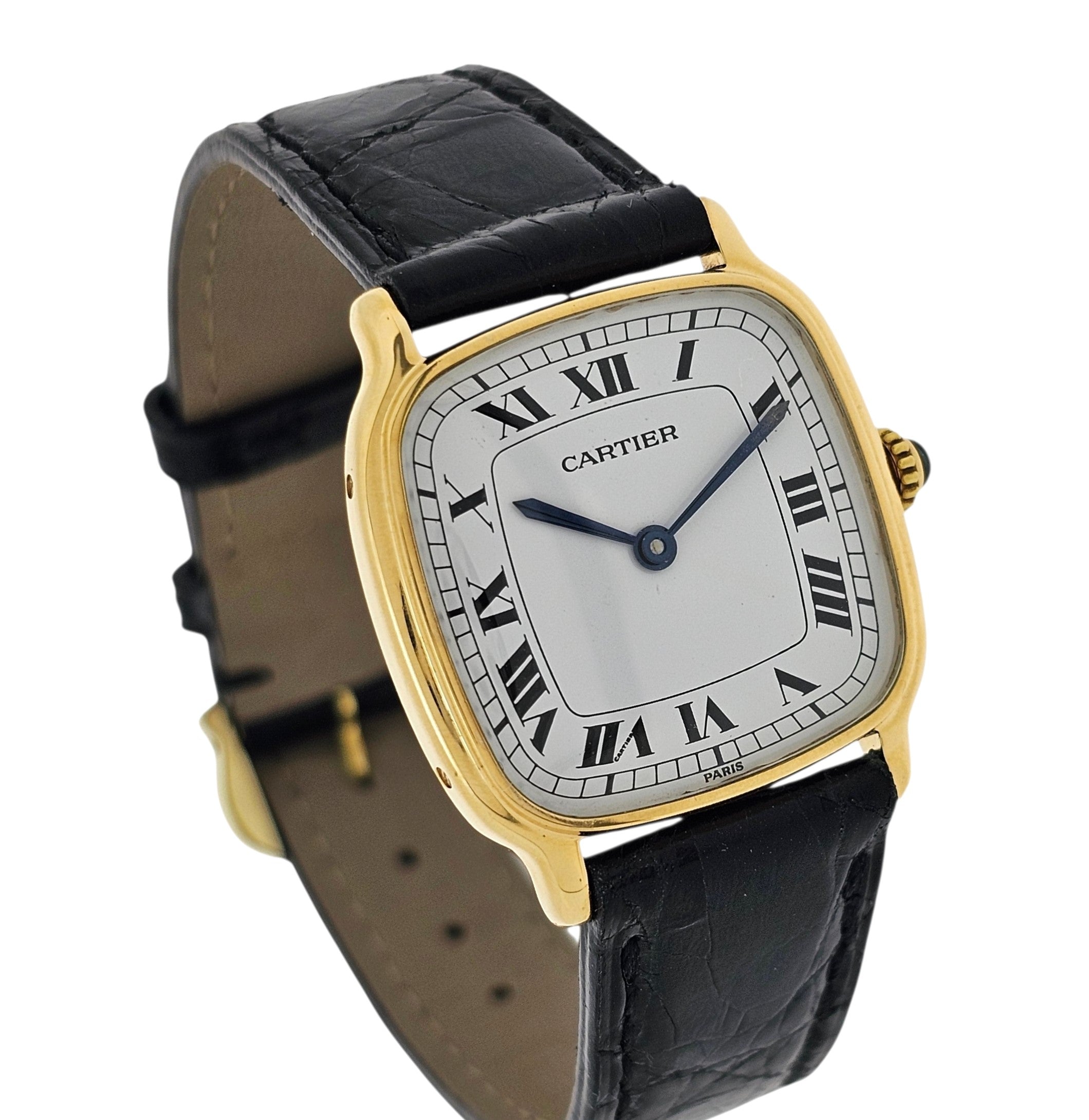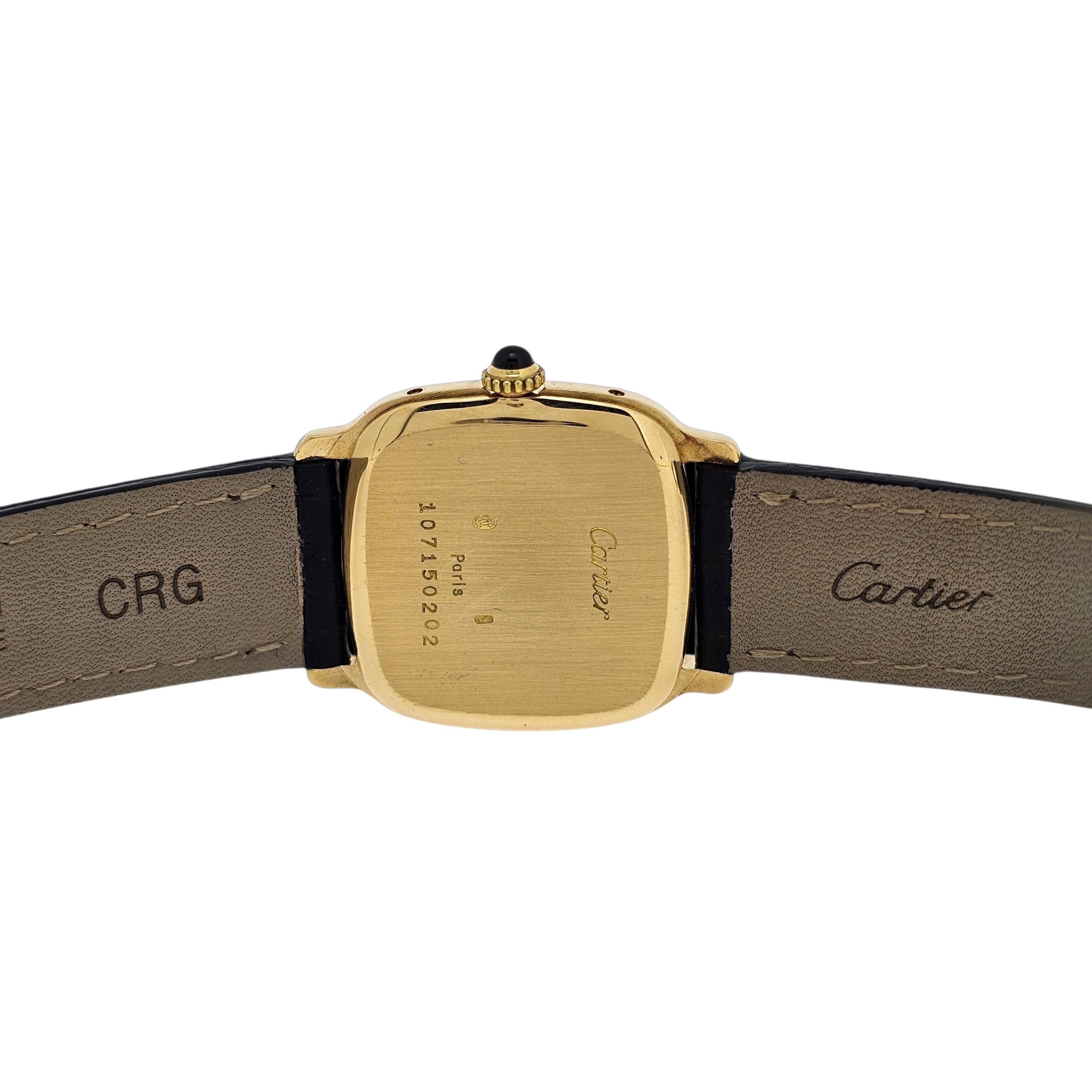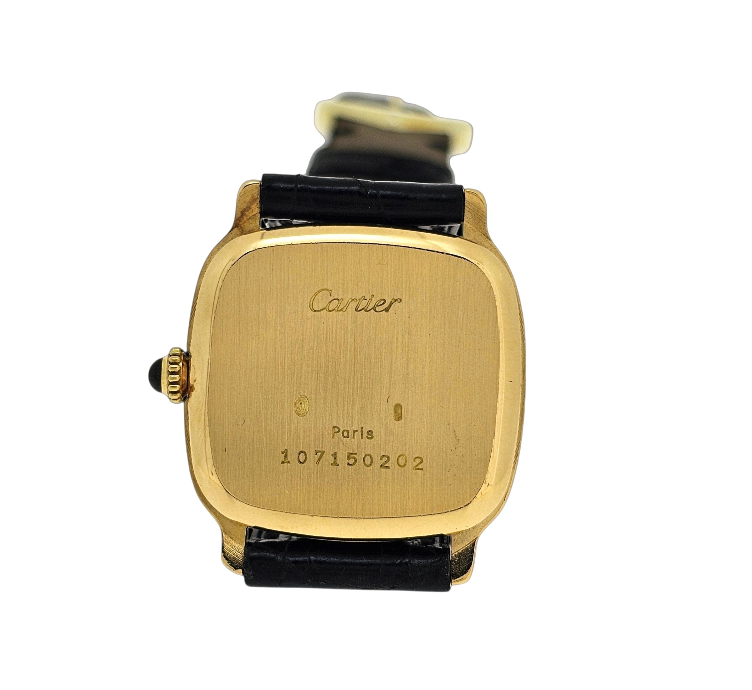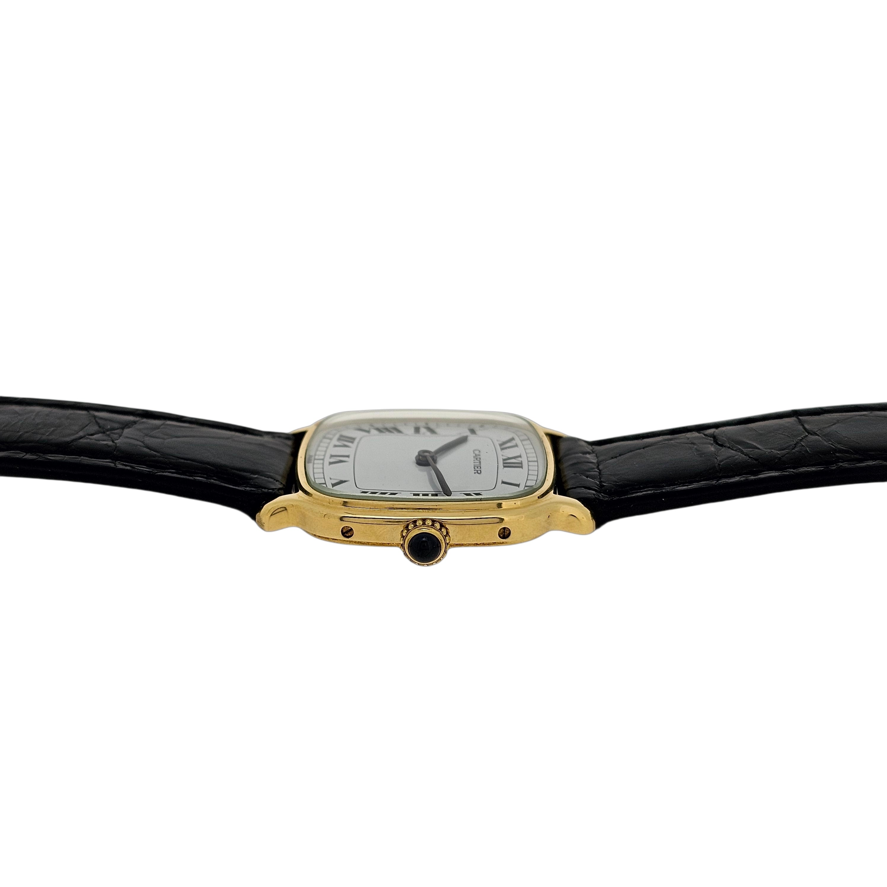 Condition:  Excellent like new.  The watch shows hardly any ware.  the edges are sharp and the hallmarks are crisp.  The watch comes with a new Carter black crocodile strap and a Cartier buckle.