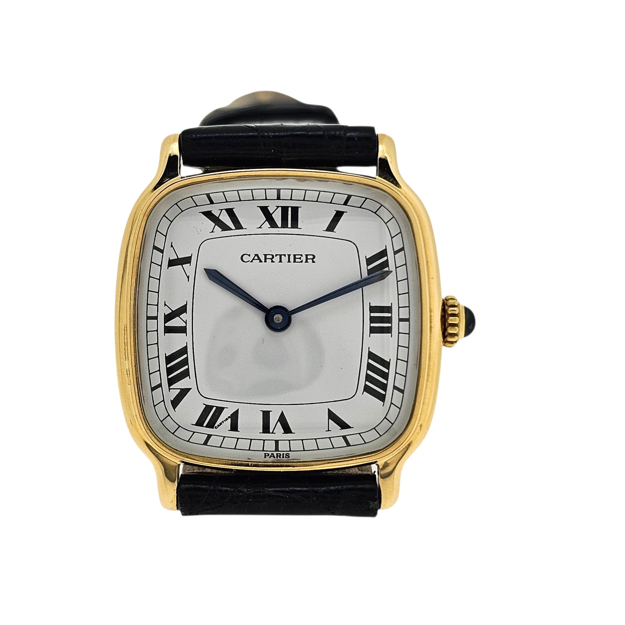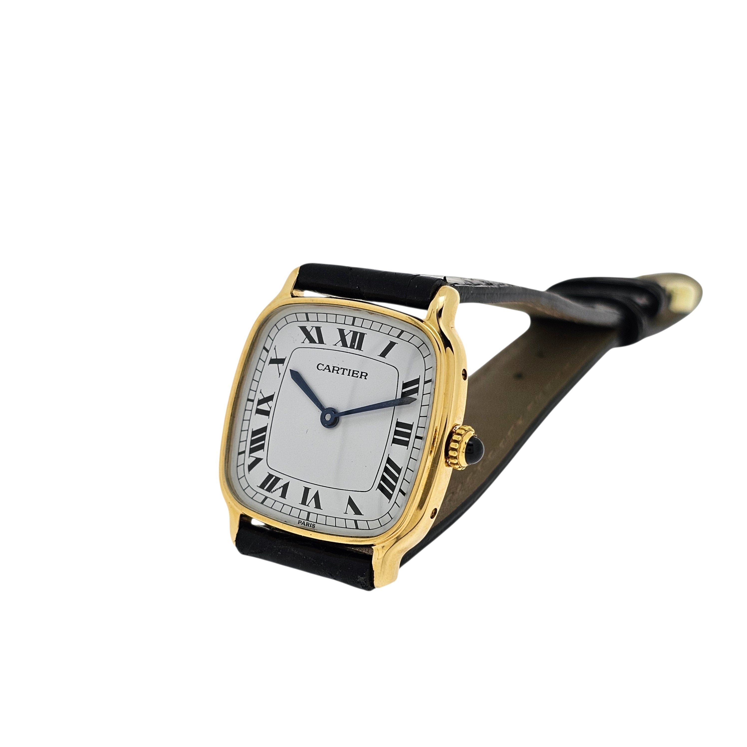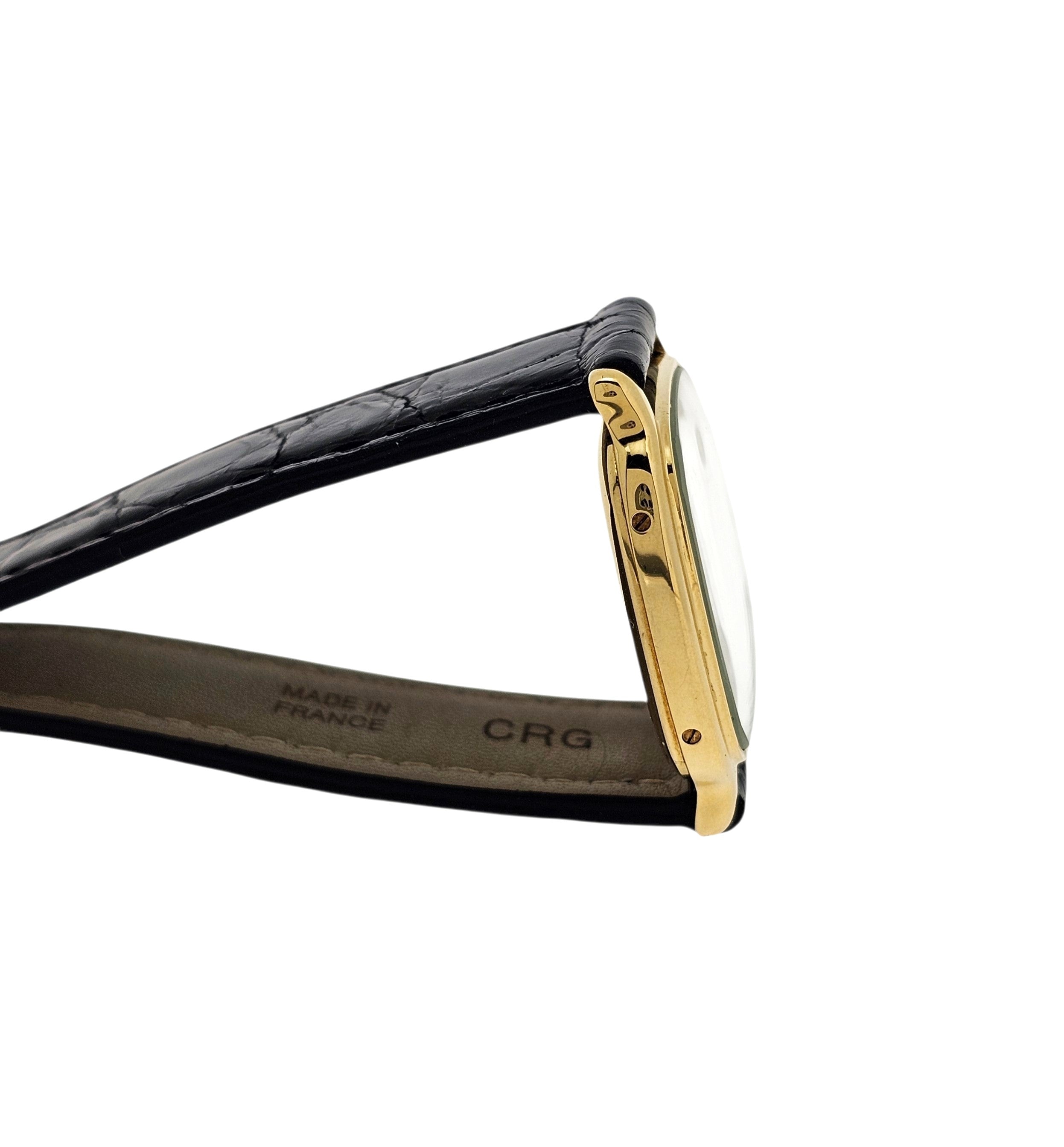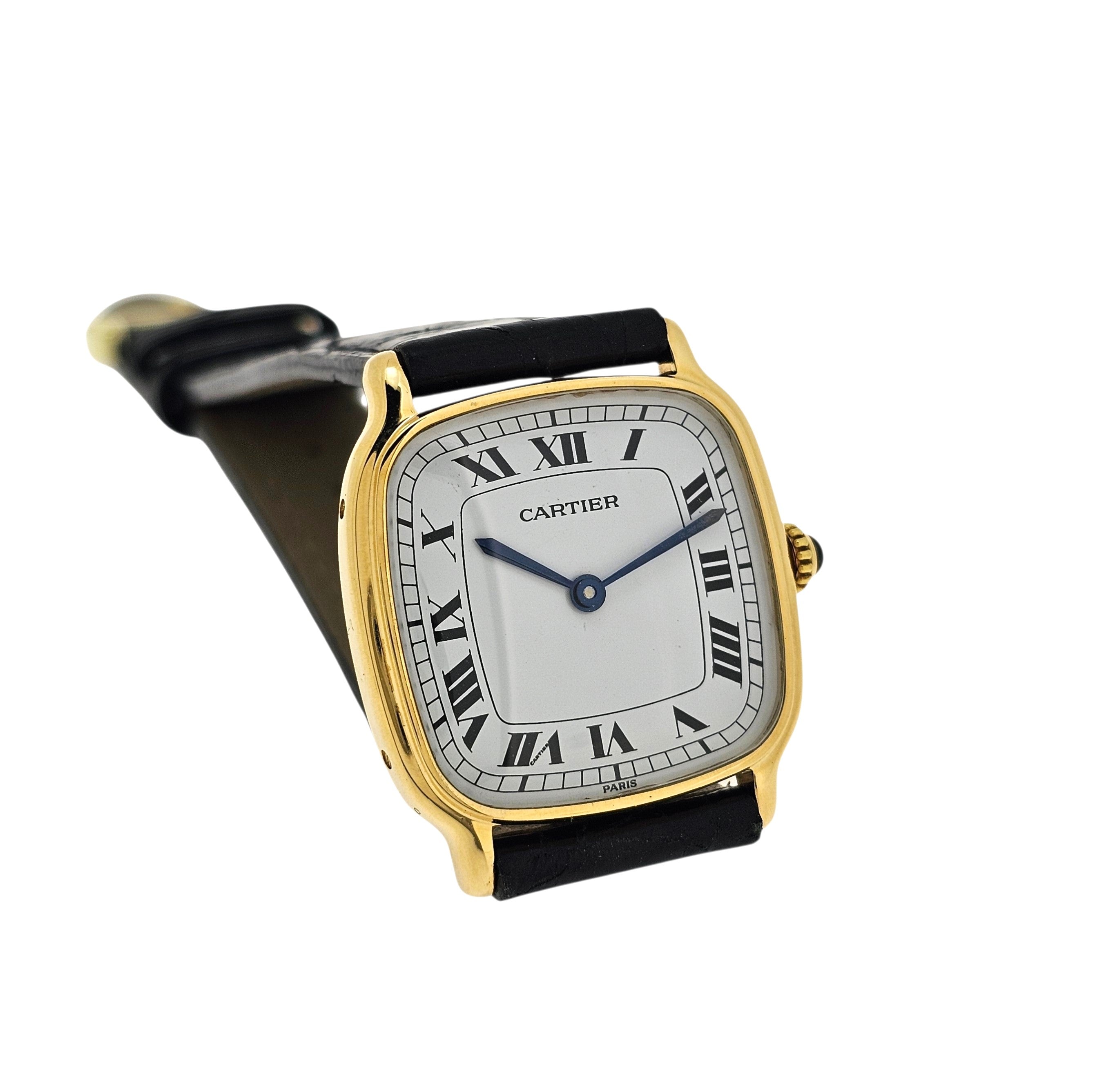 Condition:  Excellent like new.  The watch shows hardly any ware.  the edges are sharp and the hallmarks are crisp.  The watch comes with a new Carter black crocodile strap and a Cartier buckle.