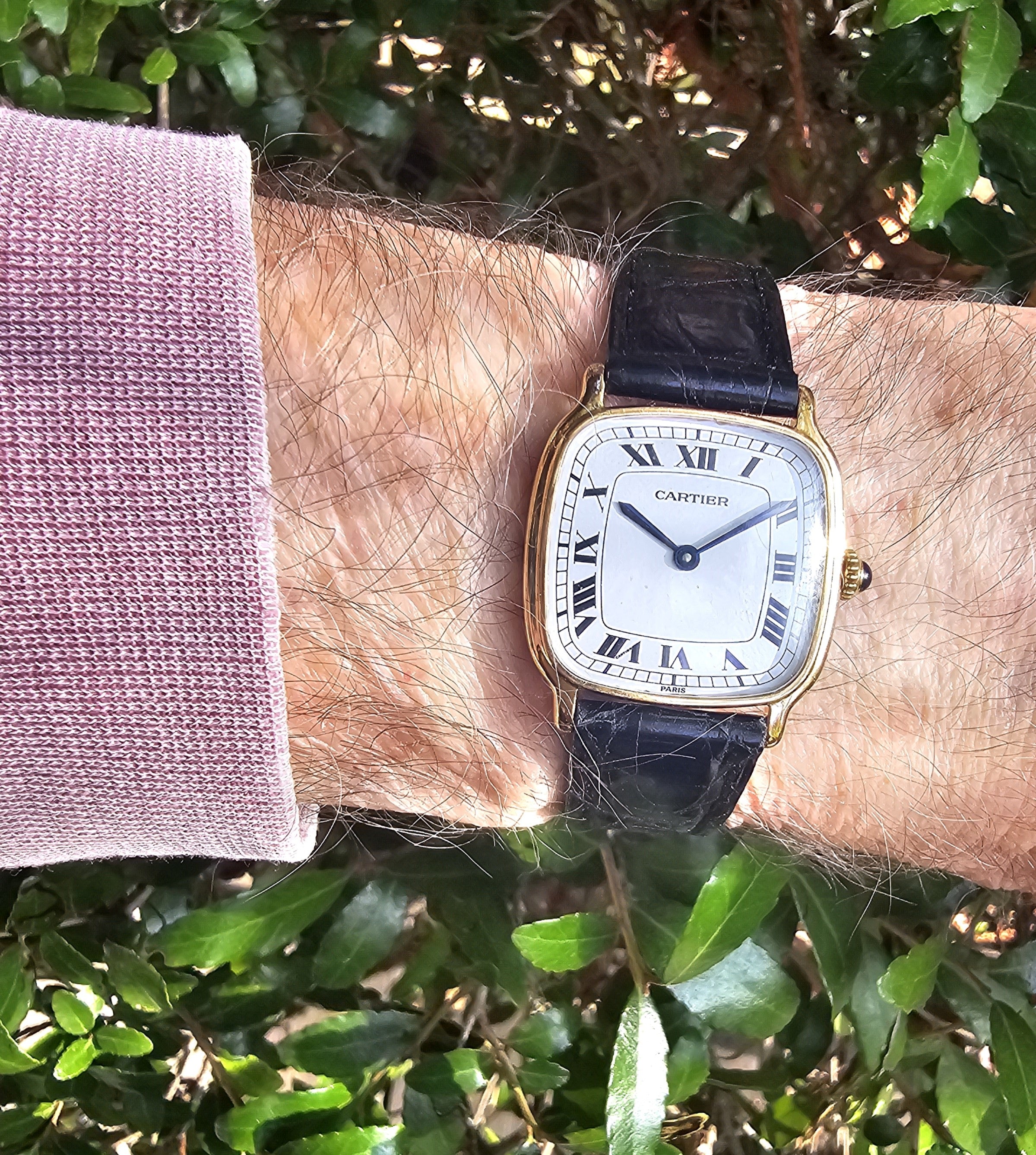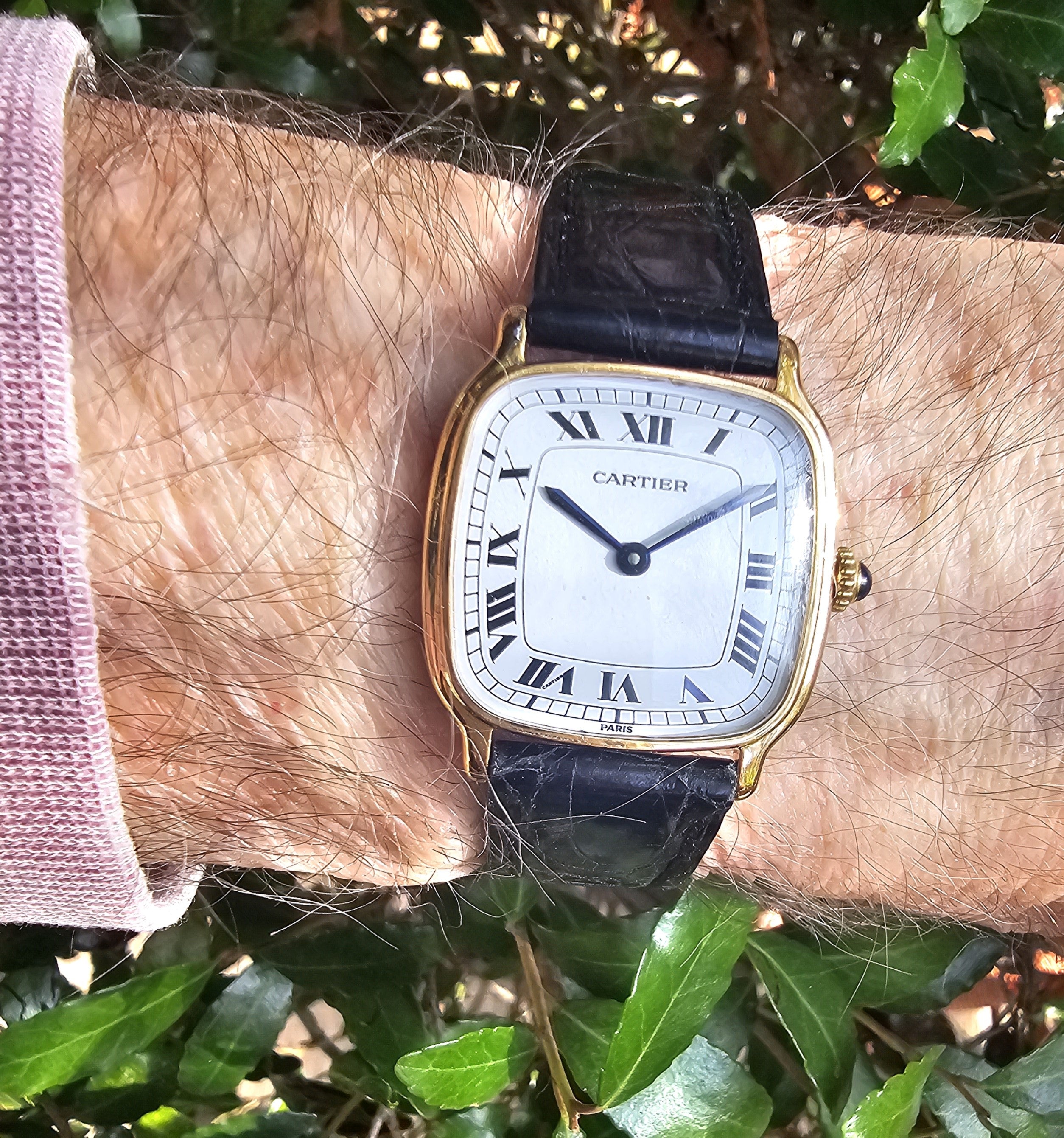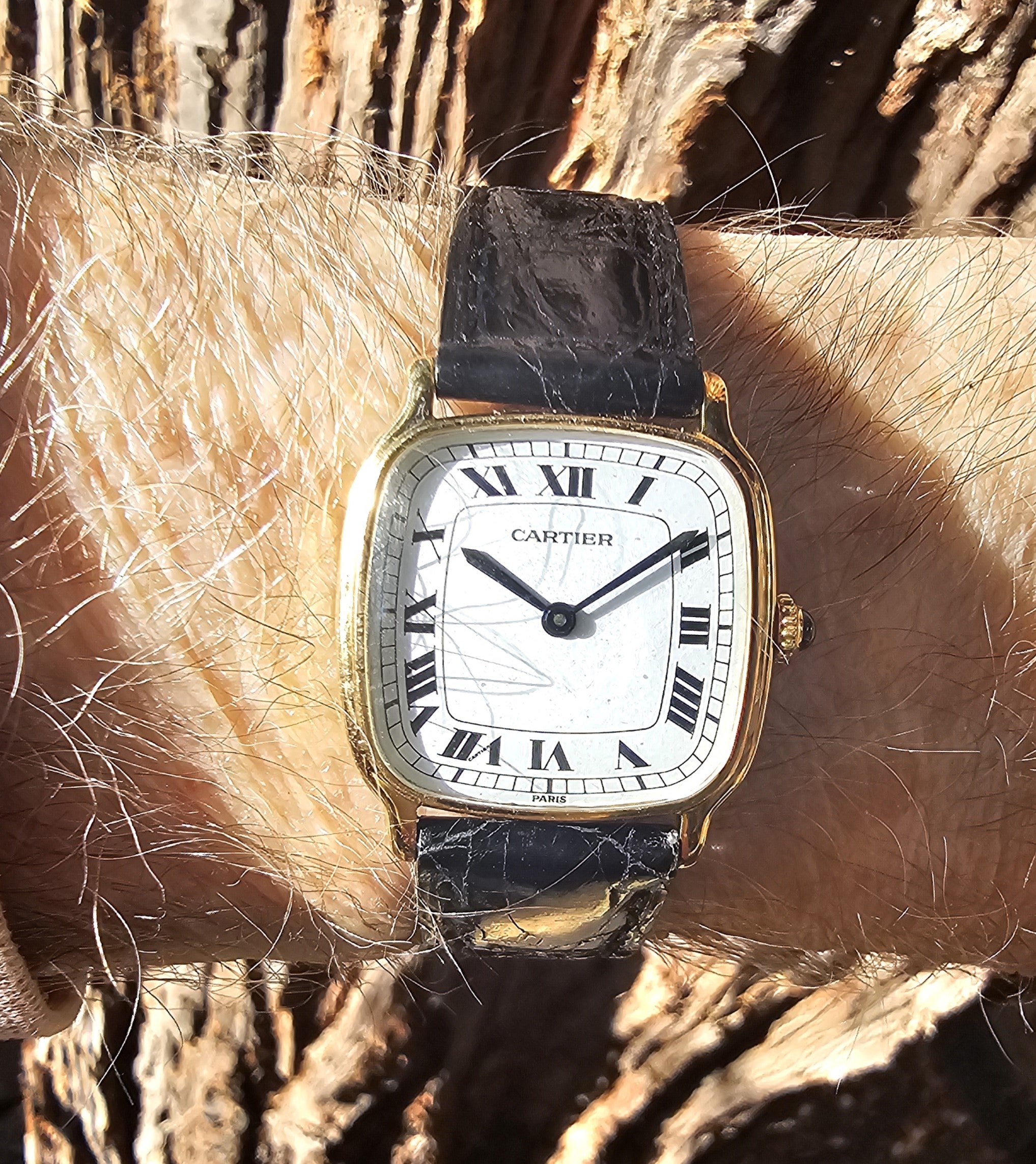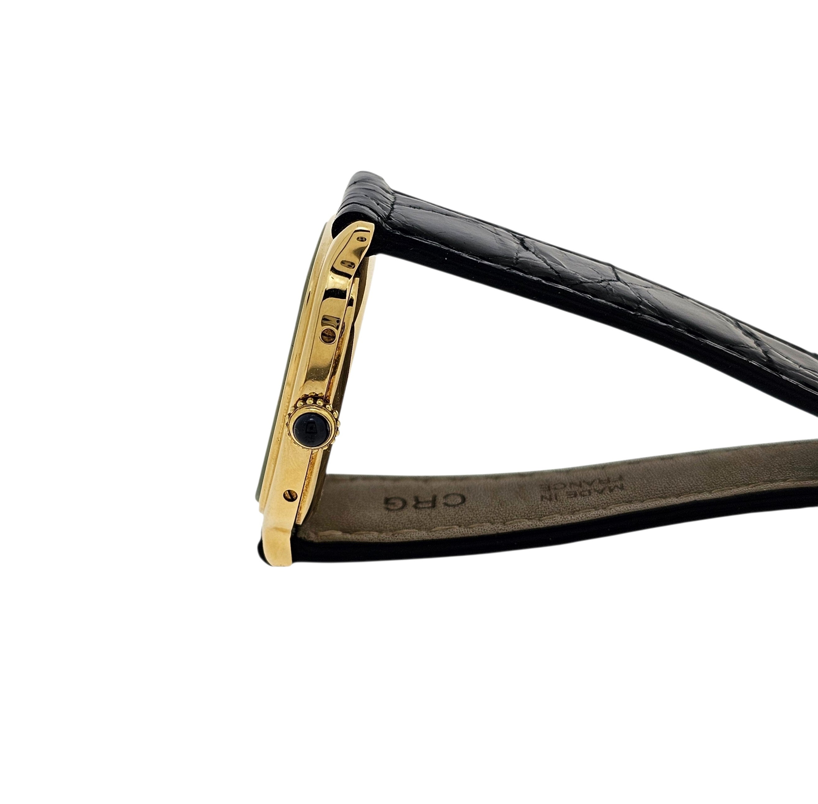Condition:  Excellent like new.  The watch shows hardly any ware.  the edges are sharp and the hallmarks are crisp.  The watch comes with a new Carter black crocodile strap and a Cartier buckle.