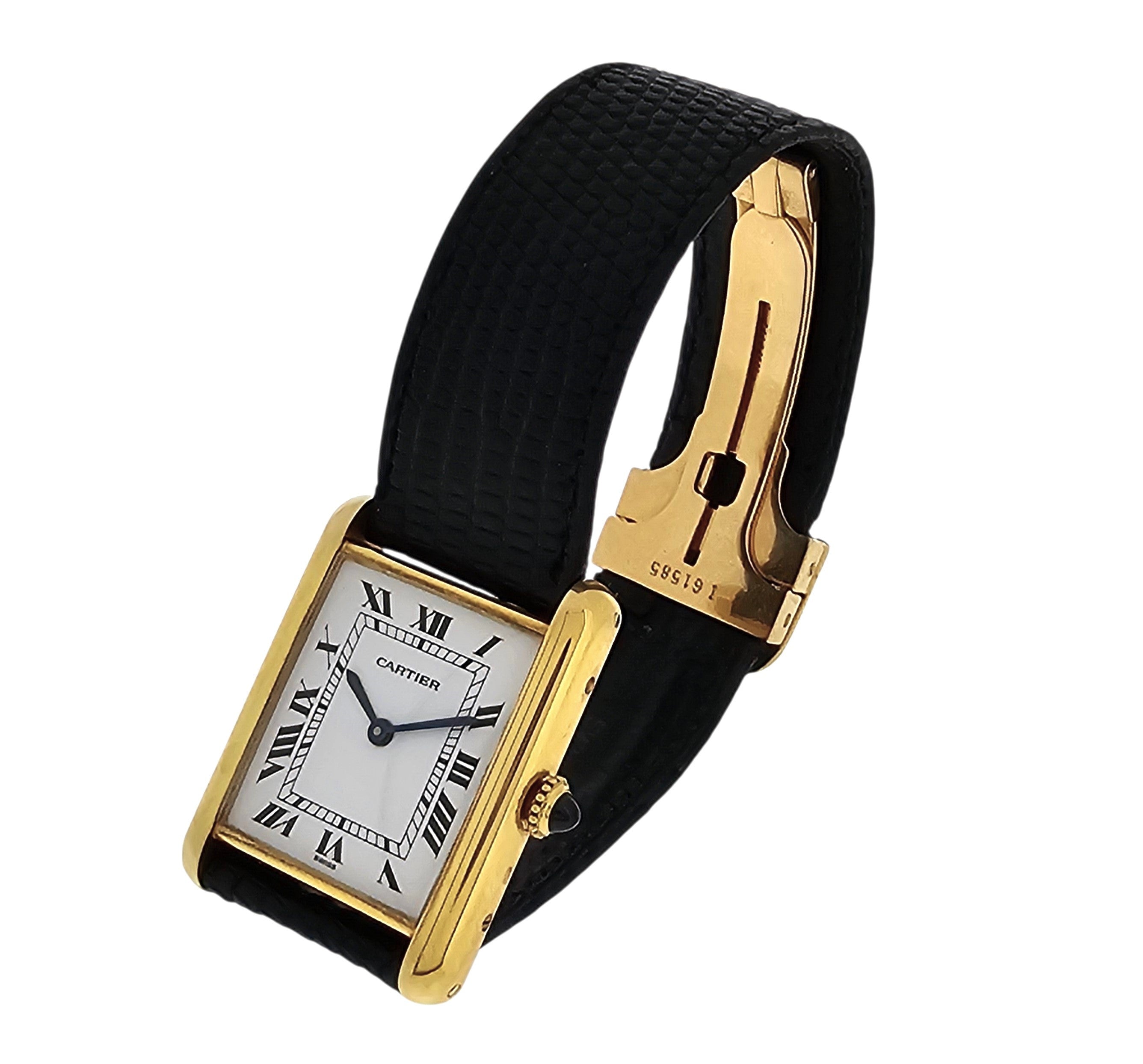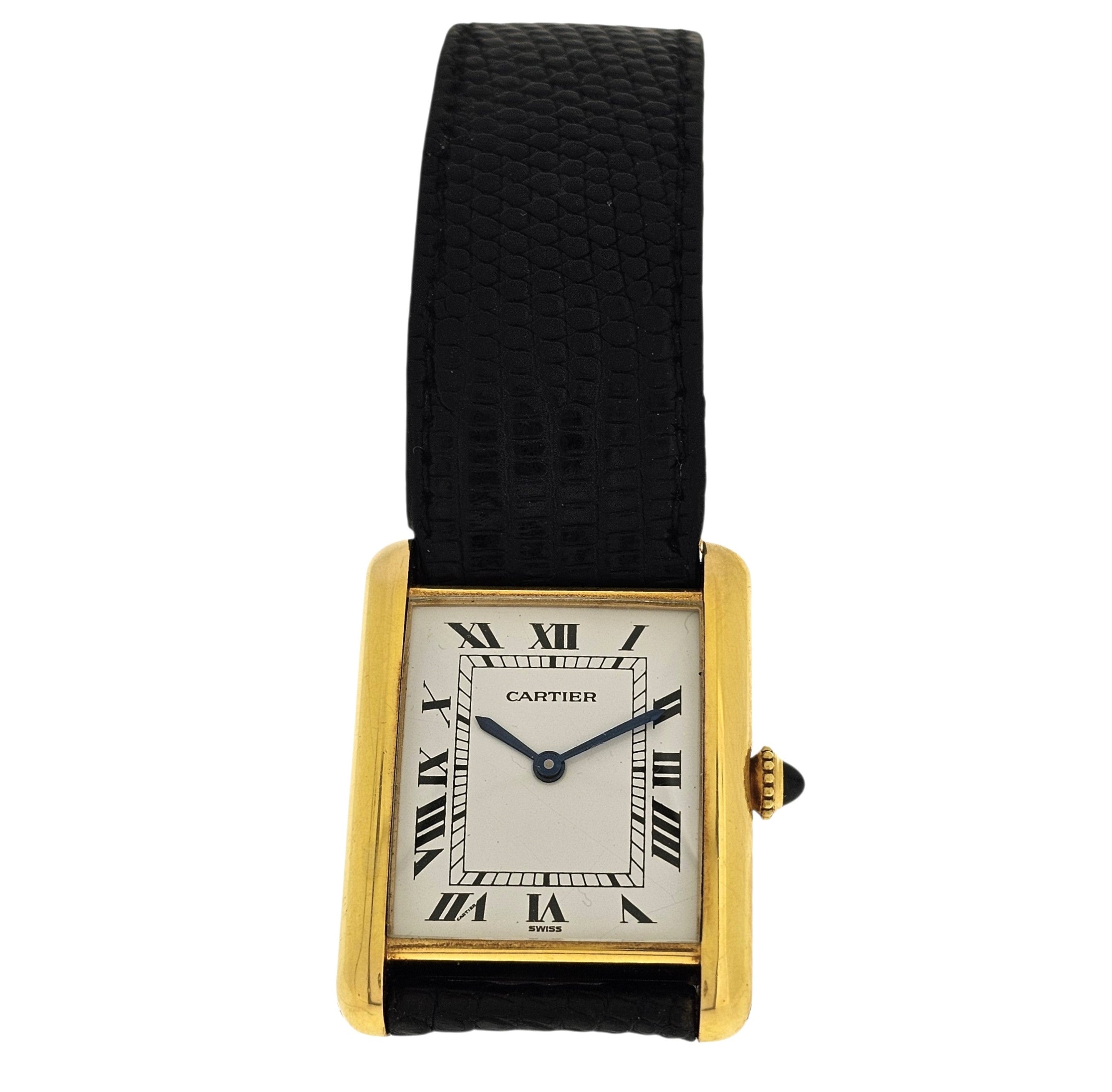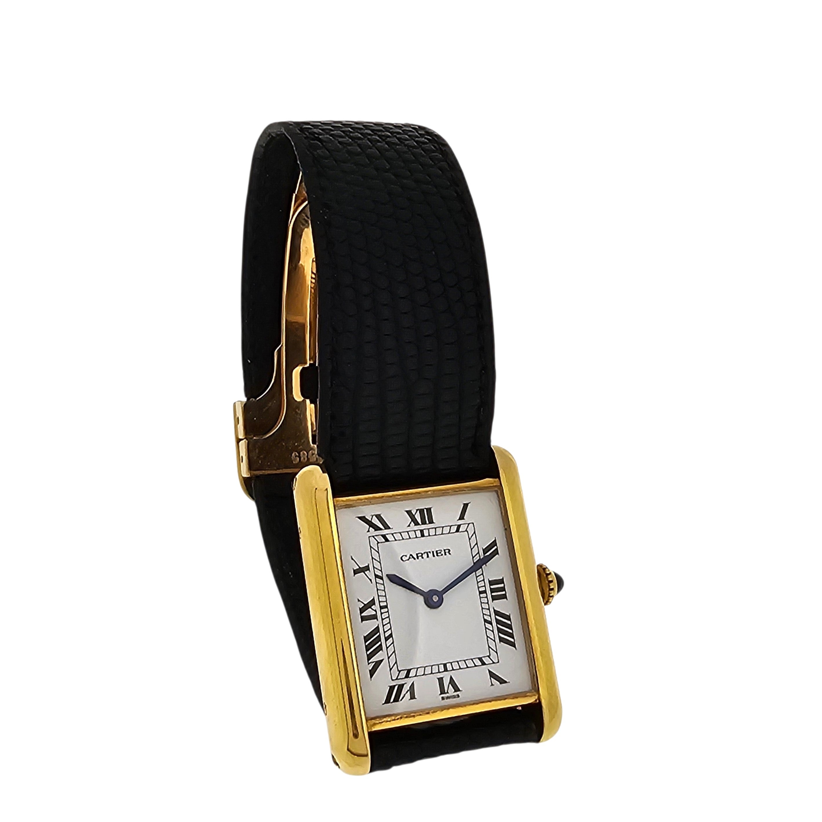 This Vintage Cartier Paris Tank Watch is made in 18 Karat yellow gold and measures 30 x 25 mm with a 17-Jewel Cartier mechanical manual wind movement. The watch is triple signed: Dial, Case, Movement, and The watch is signed Paris on the case back. The watch is fitted with a Cartier black Lizard strap and a Cartier 18 Karat gold deployant buckle. The strap appears to be an original Le Must de Cartier strap.The watch is further accompanied with its original Cartier box and guarantee card. further the watch has a one year movement guarantee.