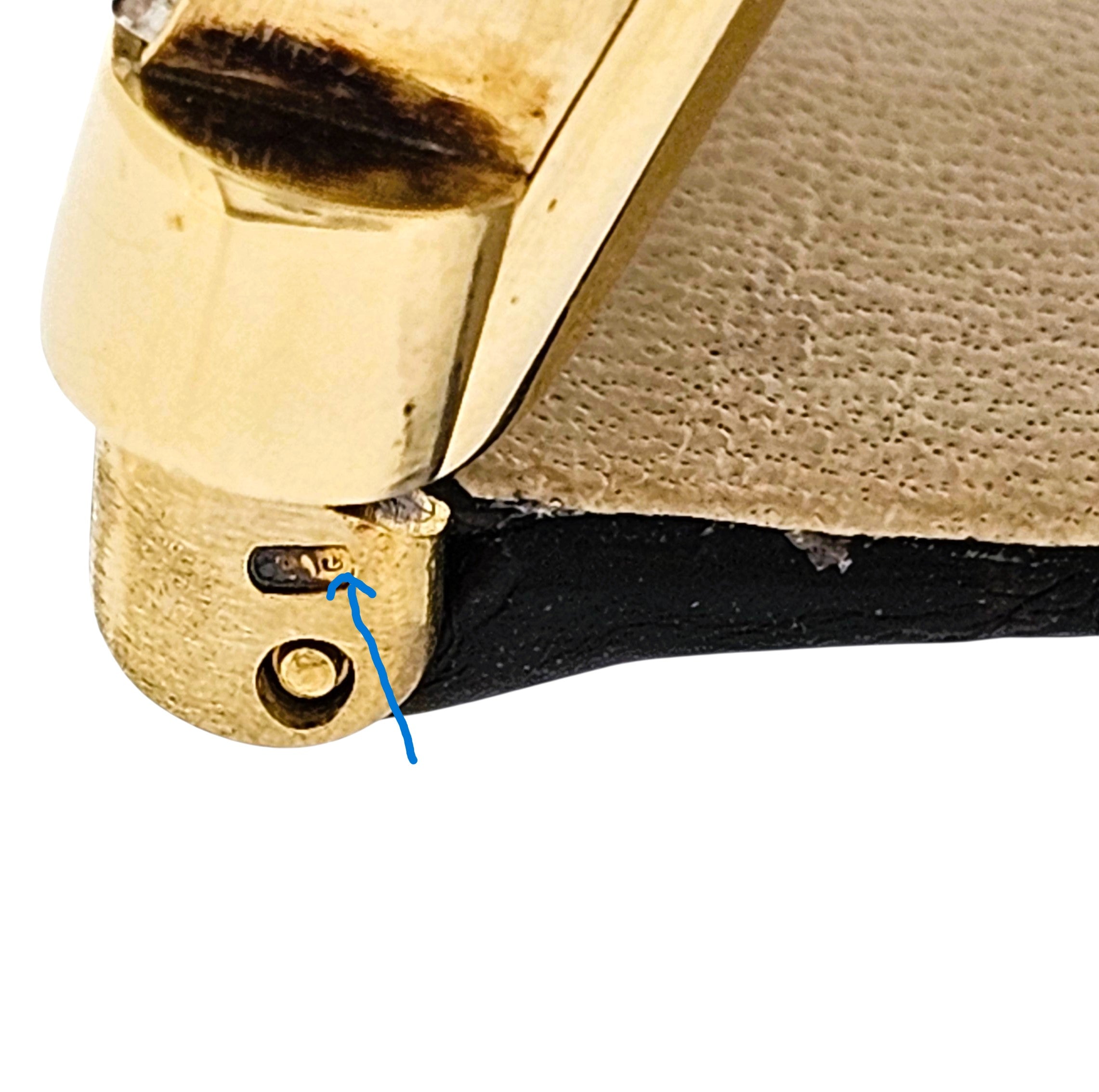 The watch is Triple signed, dial, movement and case.  The watch is fitted with a dark brown matte finish alligator strap with a yellow buckle.